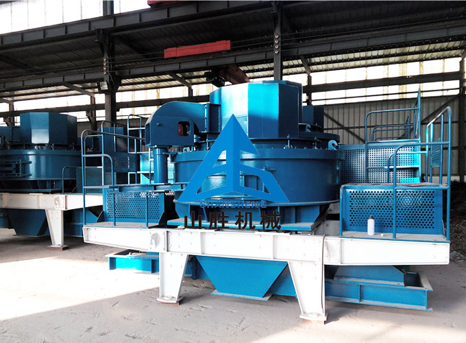 物料由进料斗进入制砂机,经分料器将物料分成两部分,一部分由分料器中间进入高速旋转的叶轮中,在叶轮内被迅速加速,其加速度可达数百倍重力加速度,然后以60-70米/秒的速度从叶轮三个均布的流道内抛射出去,首先同由分料器四周自收落下的一部分物料冲击破碎,然后一起冲击到涡支腔内物料衬层上,被物料衬层反弹,斜向上冲击到涡动腔的顶部,又改变其运动方向,偏转向下运动,从叶轮流道发射出来的物料形成连续的物料幕。这样一块物料在涡动破碎腔内受到两次以至多次几率撞击、磨擦和研磨破碎作用,被破碎的物料由下部排料口排出。